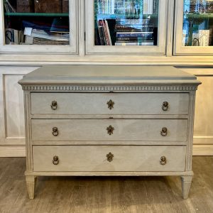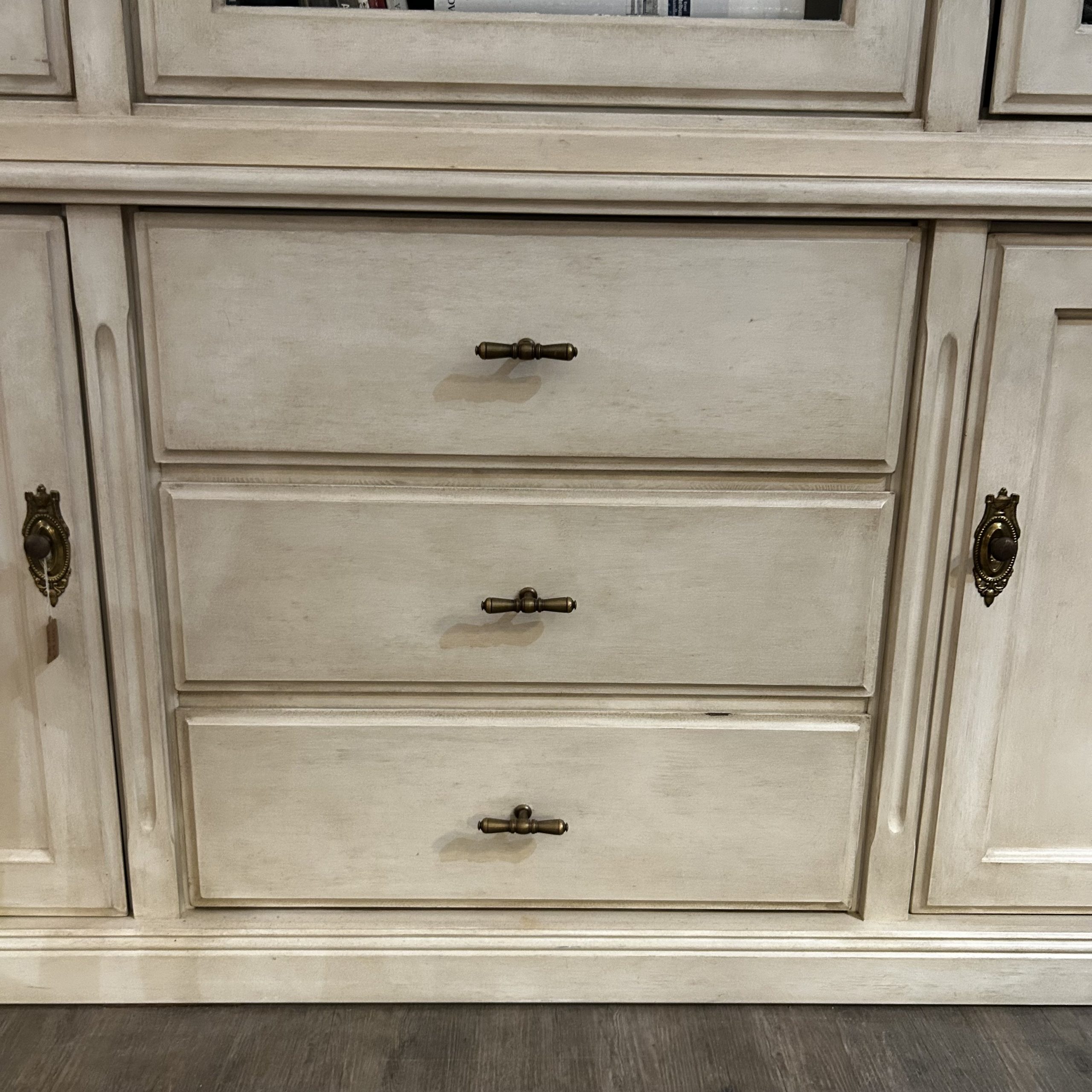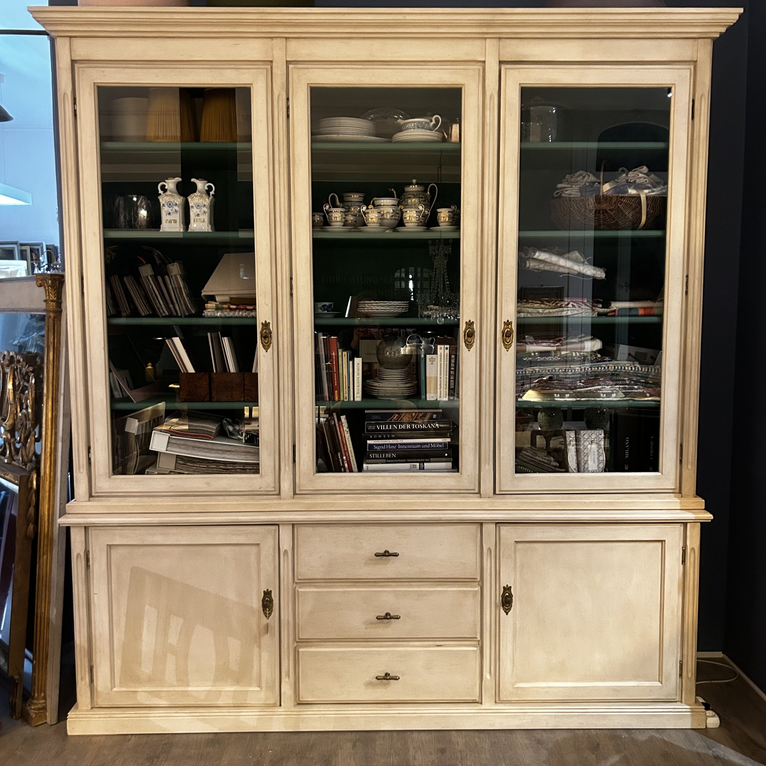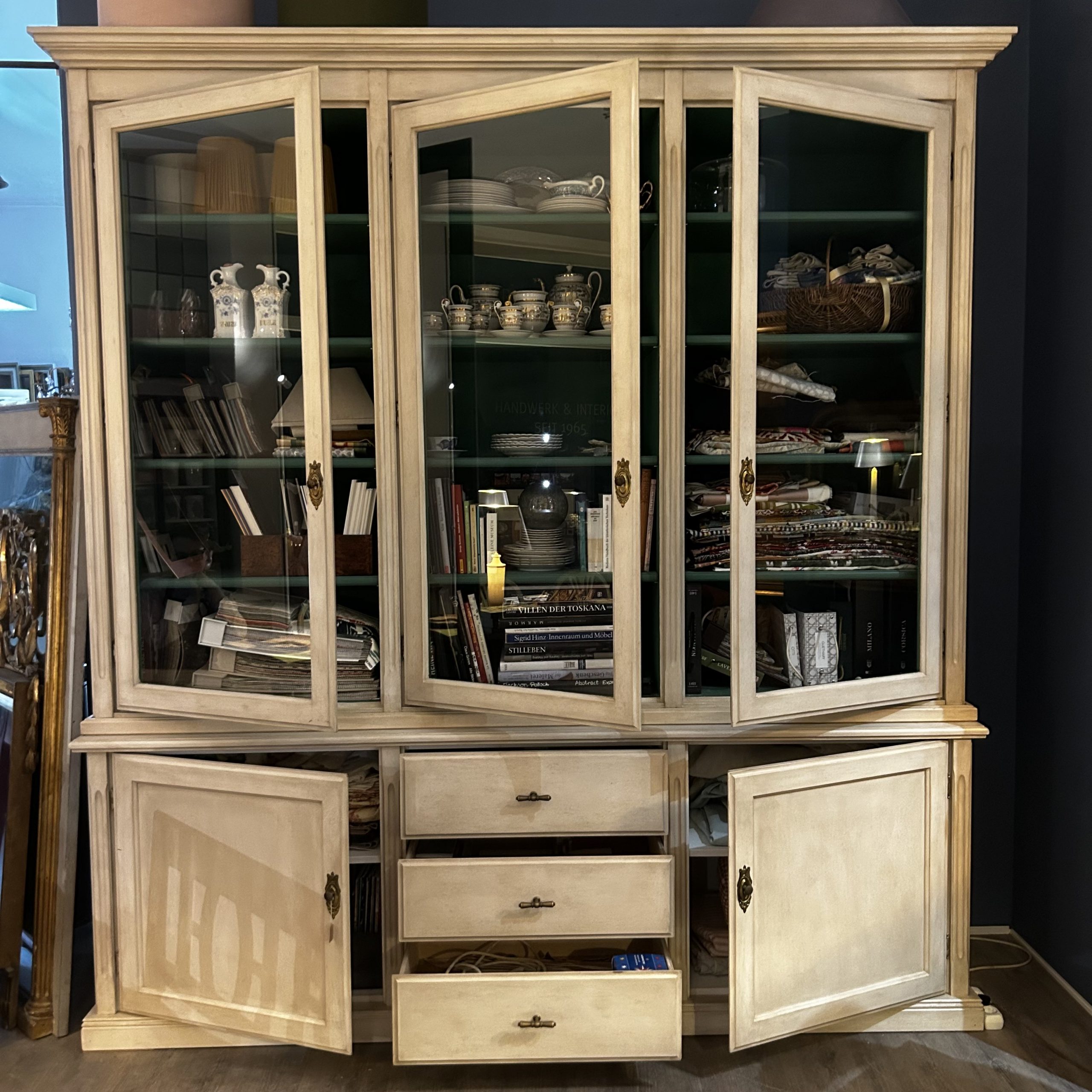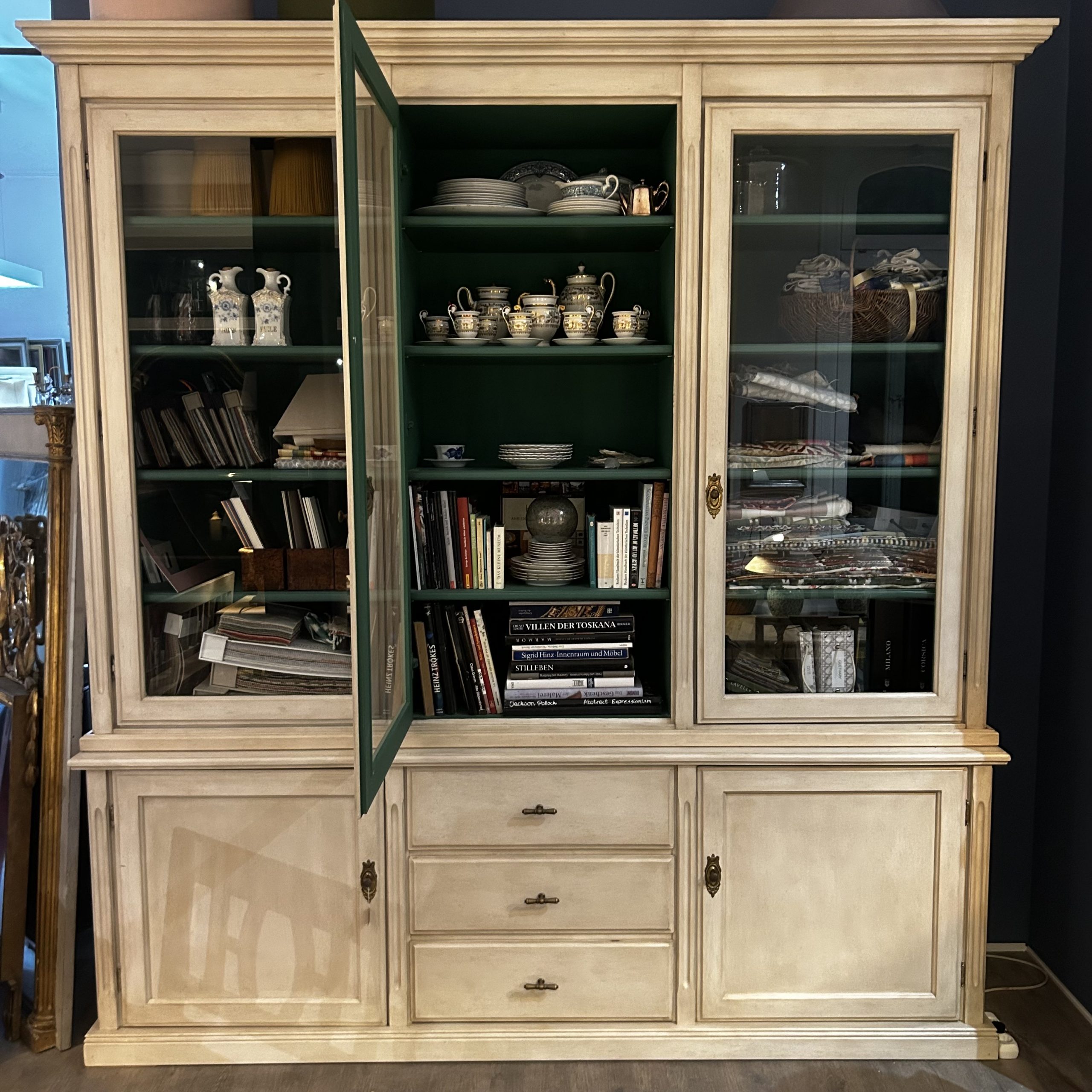 Aufsatz mit drei Türen/ Unterteil mit Schubladen und zwei Türen, hell gefasst/ innen grün
